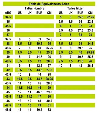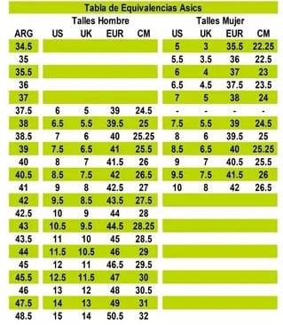 Te recomendamos elegir el calzado mirando tu talle en CM (centímetros) o comprar mirando tu talle en US o UK en otro par que tengas de la misma marca. Los CM y demás equivalencias figuran en la tabla automática que se despliega al pasar el cursor por cada talle argentino.