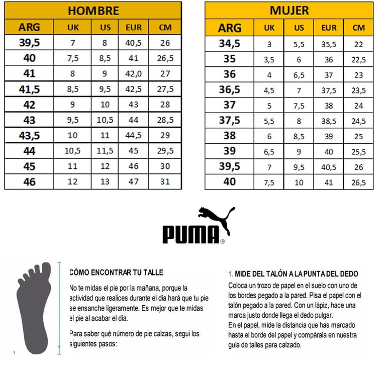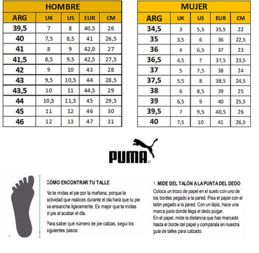 Te recomendamos elegir el calzado mirando tu talle en CM (centímetros) o comprar mirando tu talle en US o UK en otro par que tengas de la misma marca. Los CM y demás equivalencias figuran en la tabla automática que se despliega al pasar el cursor por cada talle argentino.